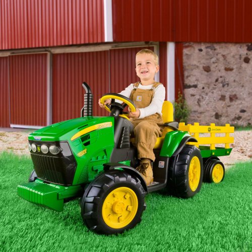 This Peg-Perego John Deere Battery Powered Ground Force Tractor with Trailer just might be the ticket to getting your youngster to love doing yard work. And why not? With a 12-volt motor, two speeds (2.5 and 4.5 mph), reverse, a working FM radio, and adjustable flip up armrests, we assume they'll be riding it all the time. It won't be too hard to throw a light load in the back and instruct your little boy or girl to please move it across the yard. Shortly thereafter, you'll have them riding the real thing, moving real loads, and they'll be loving it. In the mean time, this 12-volt riding toy will enchant your 3 to 6 year old. About Peg Perego After the birth of his infant son in 1949, Giuseppe Perego was unhappy with the minimal selection of juvenile products and decided to design his own baby carriage. His wife added beautiful, functional fabrics, and the overall aesthetics caught the attention of other parents in the Peregos' small Italian neighborhood. They were inundated with requests by neighbors for carriages of their own, and Peg Perego was born. Before long, the company was introducing high chairs, strollers, and other juvenile products. With each new product, the family commitment to quality continued. Always thinking forward, Peg Perego has never rested on past products or designs; it continues to stay current with parents' changing needs and new research that highlights the health and safety of infants and juveniles. Large battery powered tractor with working trailer. Large, knobby wheels for use on grass, dirt and gravel. 12-volt battery with charger, 2 speeds plus reverse. Maximum weight: 85 pounds. Detachable Trailer with 15lb Weight Capacity. Ages 3 years to 7 years. Dimensions: 67.5L x 24.5W x 26.5H inches.